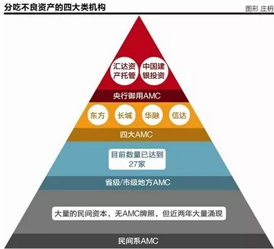 AMC是指代以收购处置金融业不良资产为主业的各类金融资产管理公司。AMC机构折价从金融机构收购不良,然后通过各种处置手段,赚取一定价差。目前参与不良资产的AMC类别较多,形成了层次分明的金字塔结构。