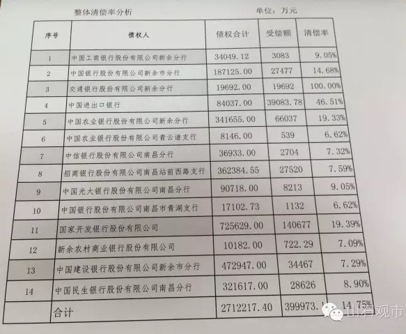 目前赛维集团破产重整,公司固定资产采用重置价值法进行评估,与破产清算采用的评估方法一样。名为破产重组实为破产清算,债权银行损失惨重。各债权银行整体清偿率为14.75%。详情如下图:
