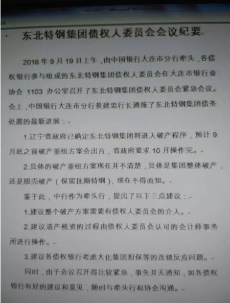 3、根据《东北特钢集团债权人委员会会议纪要》显示辽宁省政府已经确定东北特钢将进入破产程序,预计9月底之前破产重组方案会出台,省政府要求10月操作完。至此,在连续八次债务违约后,东北特钢将面临破产重组的命运。