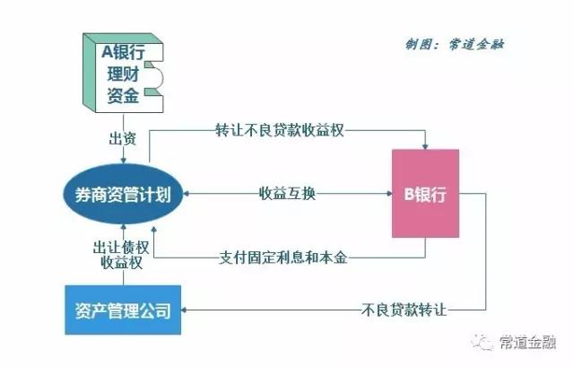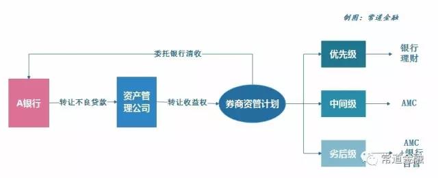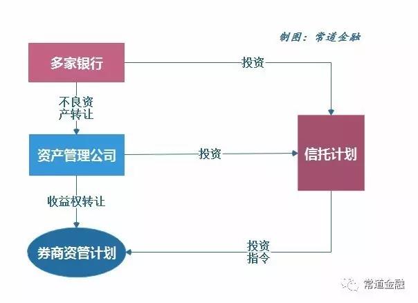 几家银行共同打包不良资产转让给资产管理公司,资产管理公司再将收益权转让给资管计划。其中银行和资产管理公司的资金通过信托公司再转给资管计划。