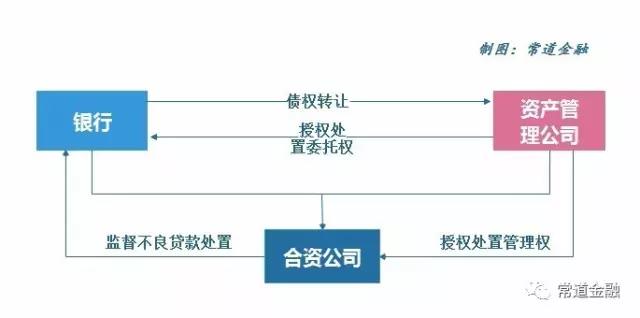 上述交易结构图中,委托清收过程还可以加入一个主体,即银行、资产管理公司共同设立的合资公司,资产管理公司将债务处置权和管理权委托给合资公司,合资公司又委托银行分行进行清收处置。