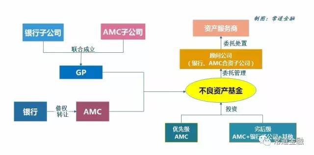 由银行投资子公司和资产管理公司子公司合资成立的一般合伙人(GP),与资产管理公司共同组建不良资产处置基金。其中,GP以现金出资,处置基金以所受让的不良贷款收益权作价出资。不良资产处置基金委托银行和资产管理公司子公司的合资顾问公司进行管理,再由其委托资产服务商进行处置。优先级由资产管理公司认购,次级投资人包括资产管理公司、银行子公司和其他投资机构。