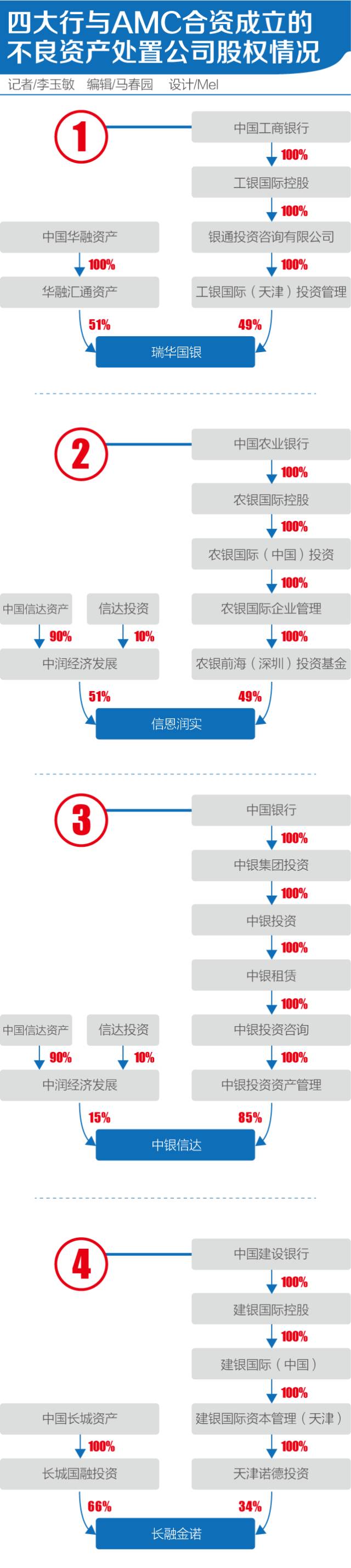 21世纪经济报道记者通过多方采访及查询工商登记资料发现,工农中建四大行均通过旗下香港子公司下属的孙公司等多重股权关系,与华融、信达和长城合资设立了合资公司,分别为瑞华国银(工行49%,华融51%)、信恩润实(农行49%,信达51%)、中银信达(中行85%,信达15%)、长融金诺(建行34%,长城66%),并通过合资公司大量持有本行的不良资产。