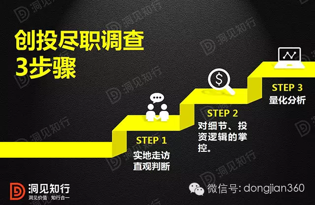 尽职调查的基本内容大同小异,但要提高质量,除了有高水准的专业中介机构的律师、会计师的配合外,创投也有自身的工作:首先是实地走访,直观判断;其次是对细节、投资逻辑的掌控;第三则是量化分析。以下我们详细介绍这三个步骤。