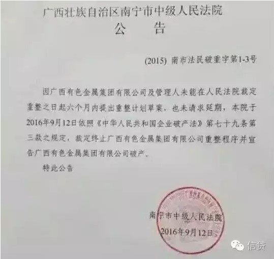 2016年9月12日,广西壮族自治区南宁市中级法院于9月12日宣告终止广西有色重整程序,并宣告公司破产。原因是广西有色及管理人未能在人民法院裁定重整之日起六个月内提出重整计划草案,至今也未申请延期。